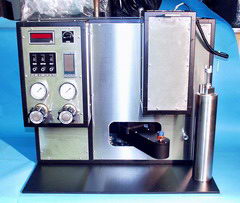 Зубчатая передача сообщается с лопаткой для перемешивания раствора, лопатка идентична лопатке атмосферного консистометра. Температура устанавливается с помощью цифрового PID-контроллера, в ячейке поддерживается необходимое давление для предотвращения испарения